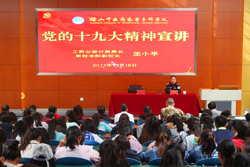 为认真学习宣传贯彻党的十九大精神,12月15日,市公安局工贸园区分局局长王小平到保山中医药专科学校宣讲十九大精神。